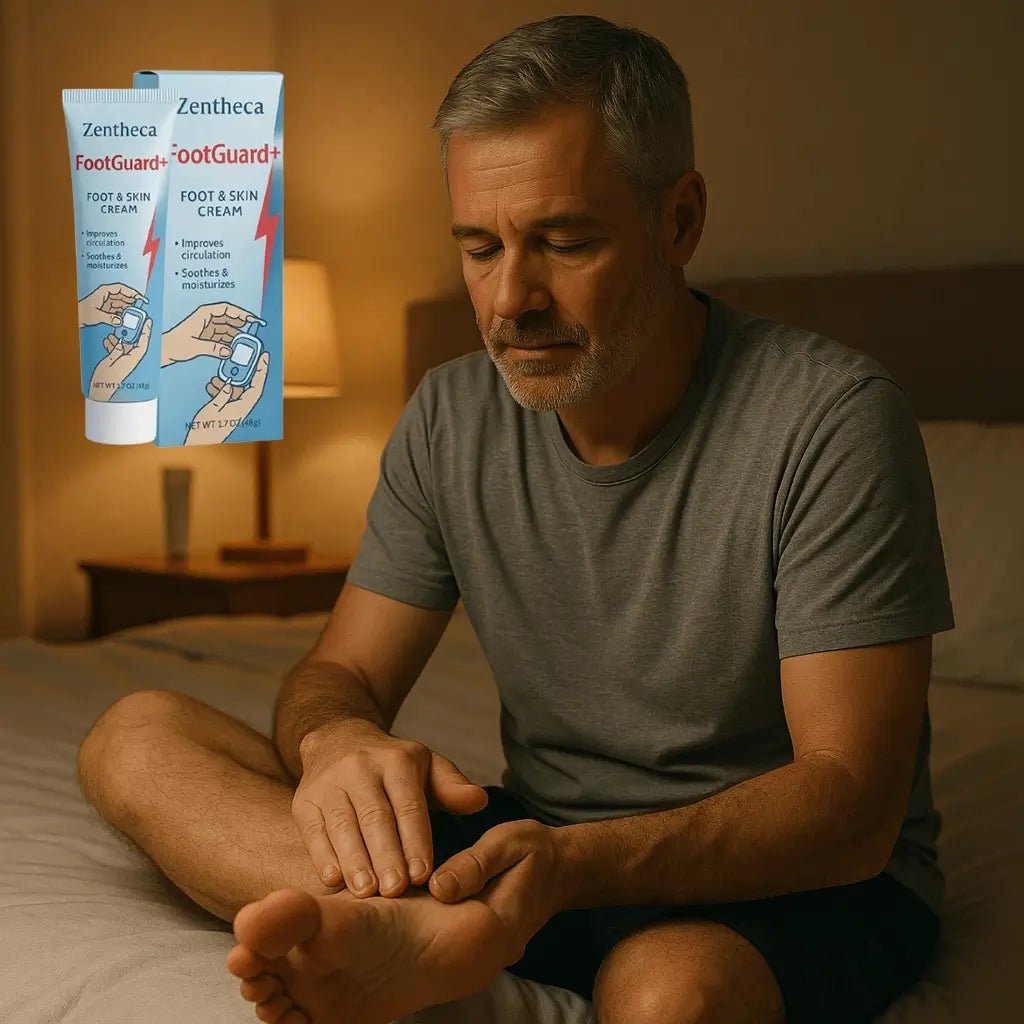 Zentheca FootGuard+ is the first all-in-one topical treatment specifically formulated to address the complete spectrum of diabetic foot challenges – from preventing unseen injuries to accelerating wound healing, all while providing the deep hydration your vulnerable skin desperately needs.